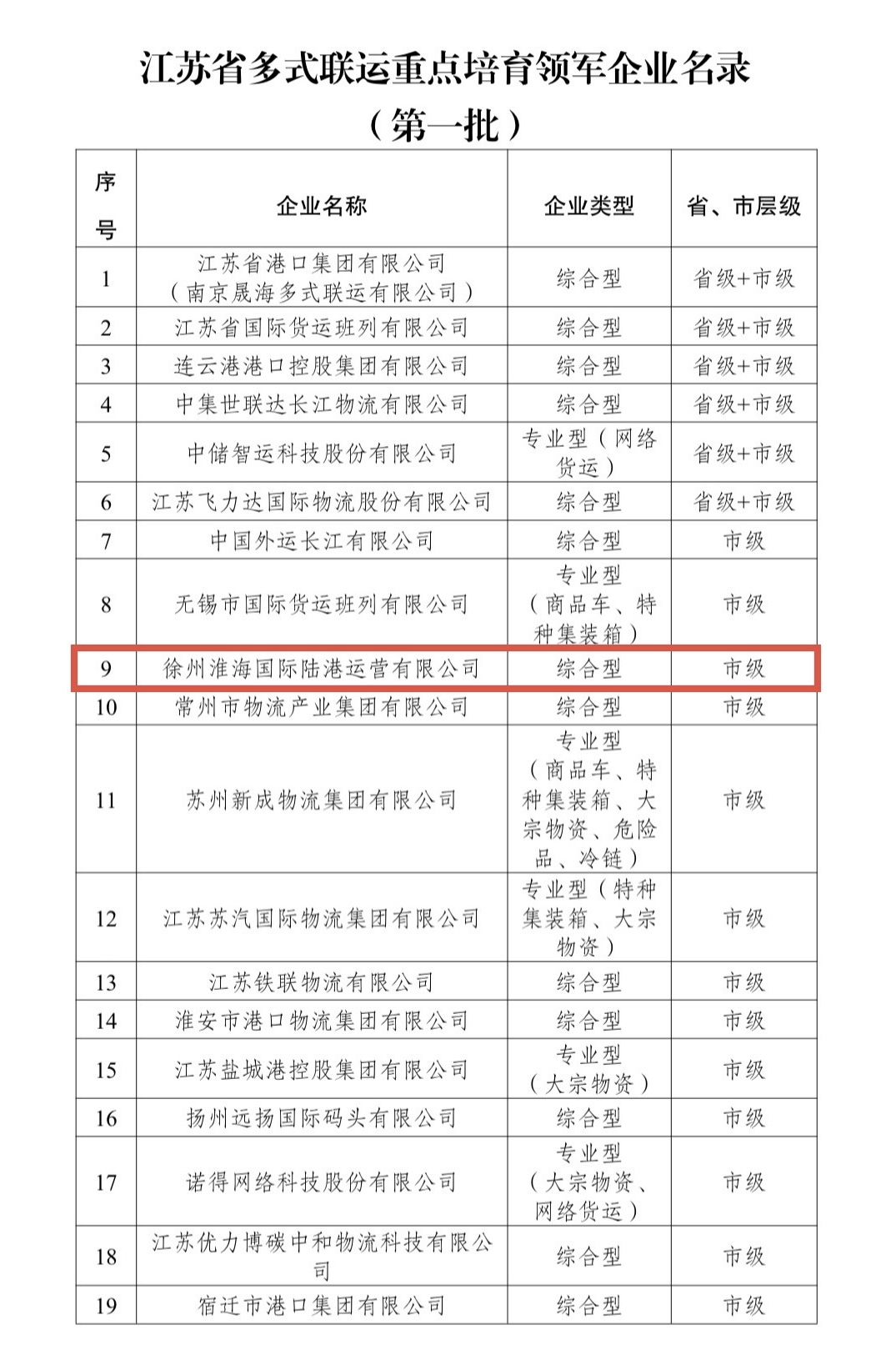 近日,江蘇省交通運(yùn)輸廳出臺(tái)《江蘇省推動(dòng)多式聯(lián)運(yùn)企業(yè)梯度培育工作方案》,并公布第一批19家重點(diǎn)培育企業(yè)名錄。徐州陸港集團(tuán)所屬徐州淮海國(guó)際陸港運(yùn)營(yíng)有限公司憑借卓越的行業(yè)競(jìng)爭(zhēng)力及全鏈條多式聯(lián)運(yùn)管理和服務(wù)能力,成功入選“江蘇省多式聯(lián)運(yùn)重點(diǎn)培育領(lǐng)軍企業(yè)名錄(綜合型)”。